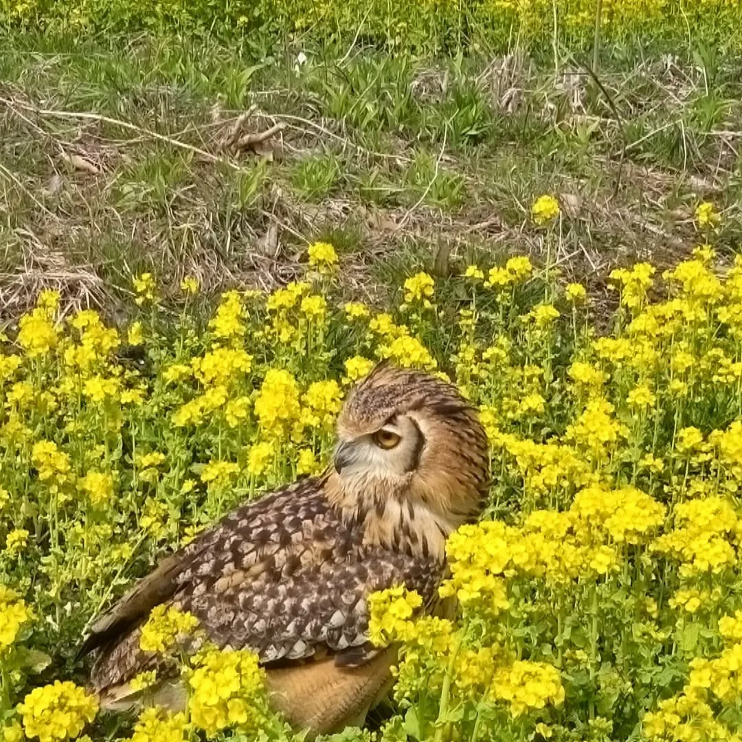 菜の花畑ではカメラを構えた人が集まっていて、何かと思ったら、そこにフクロウがいるではありませんか。私も犬を抱っこしながら、フクロウに近づいてスマホでパチリ。良い写真が撮れました。