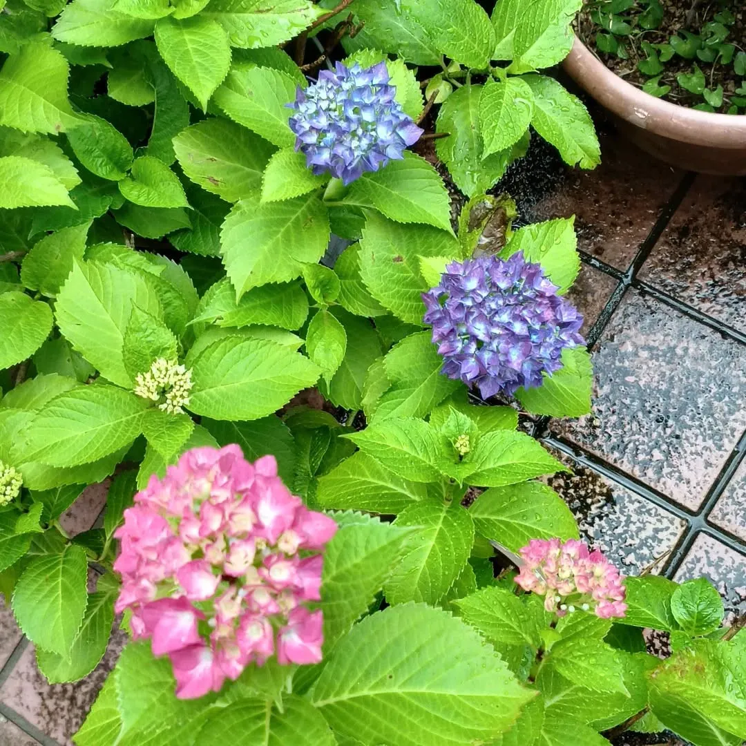 我が家の庭には、赤と紫の紫陽花が並んで咲いています。まだ咲き始めですが、これから大きな大輪になるでしょう。