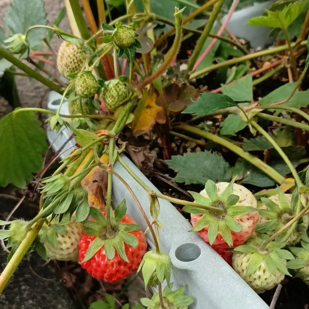 我が家の庭には鉢植えのイチゴがあります。このほど、いくつか実が出来始めました。